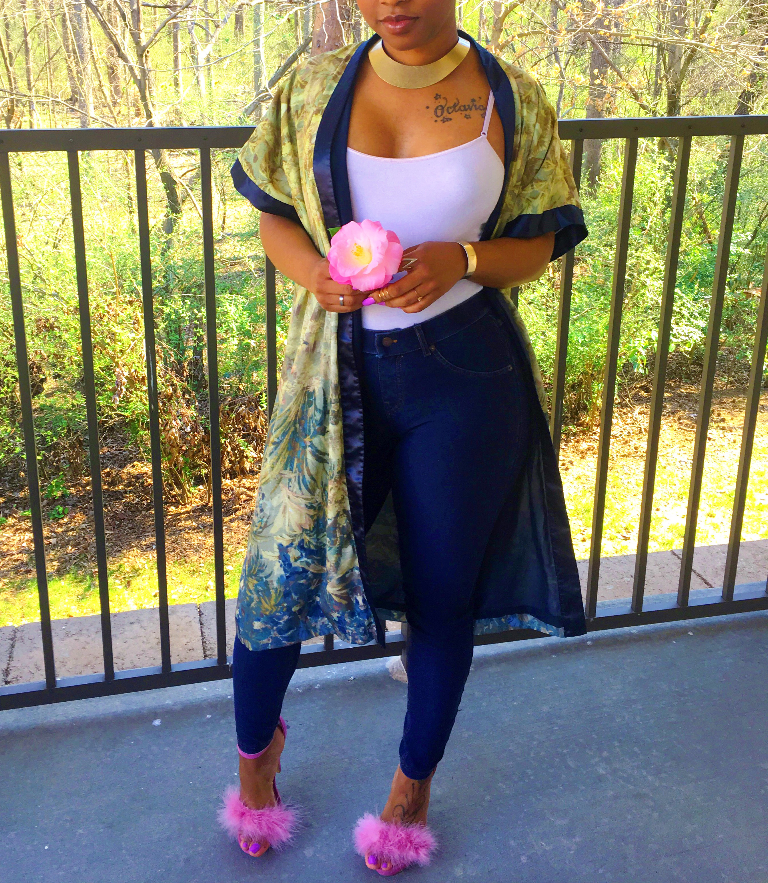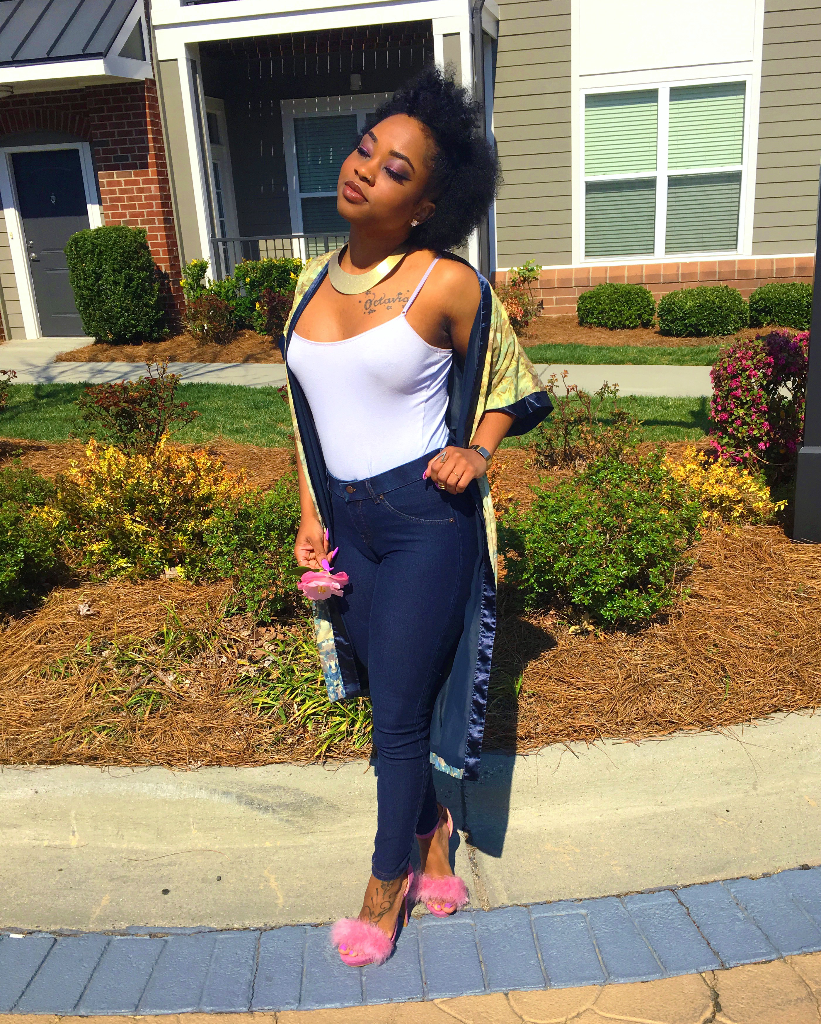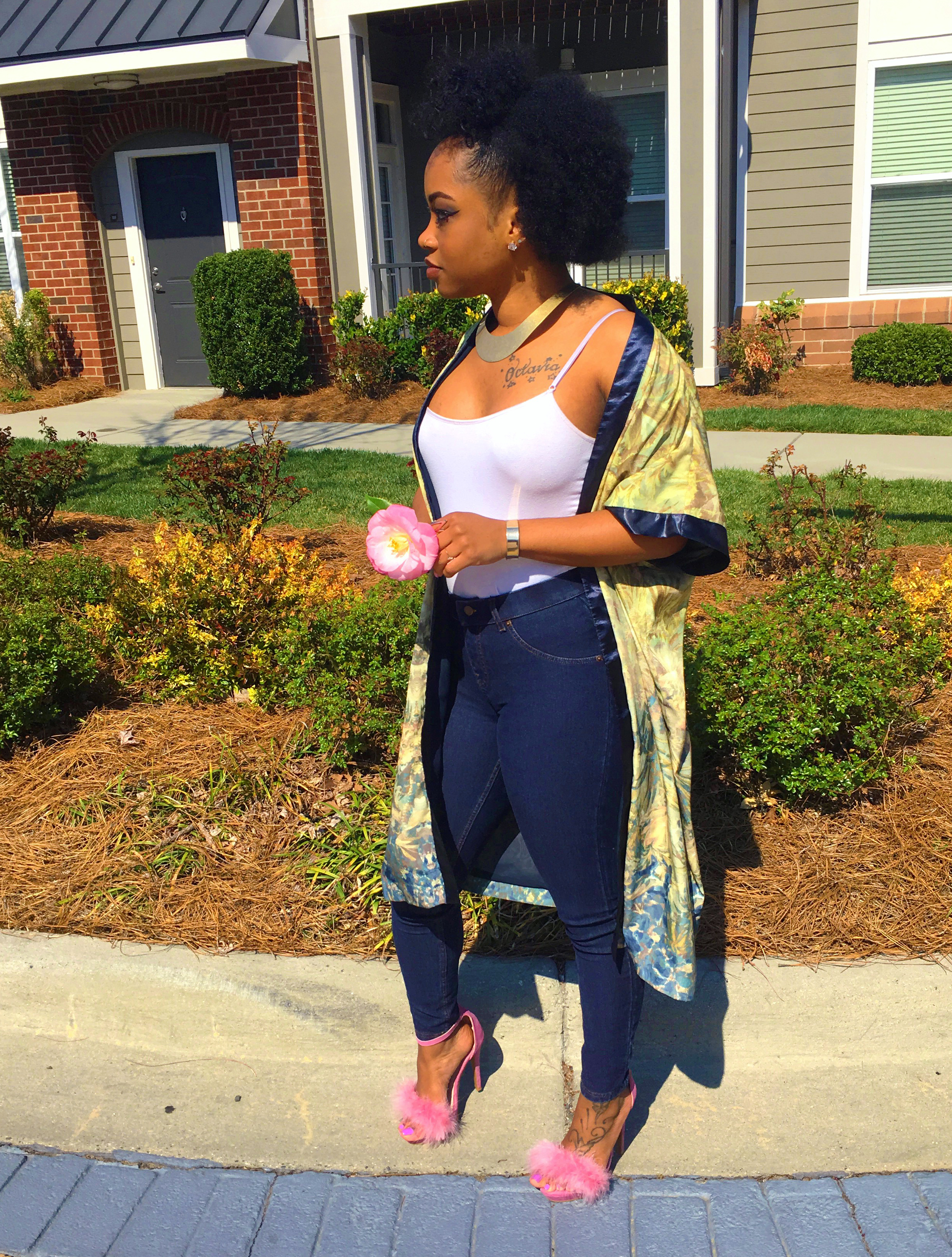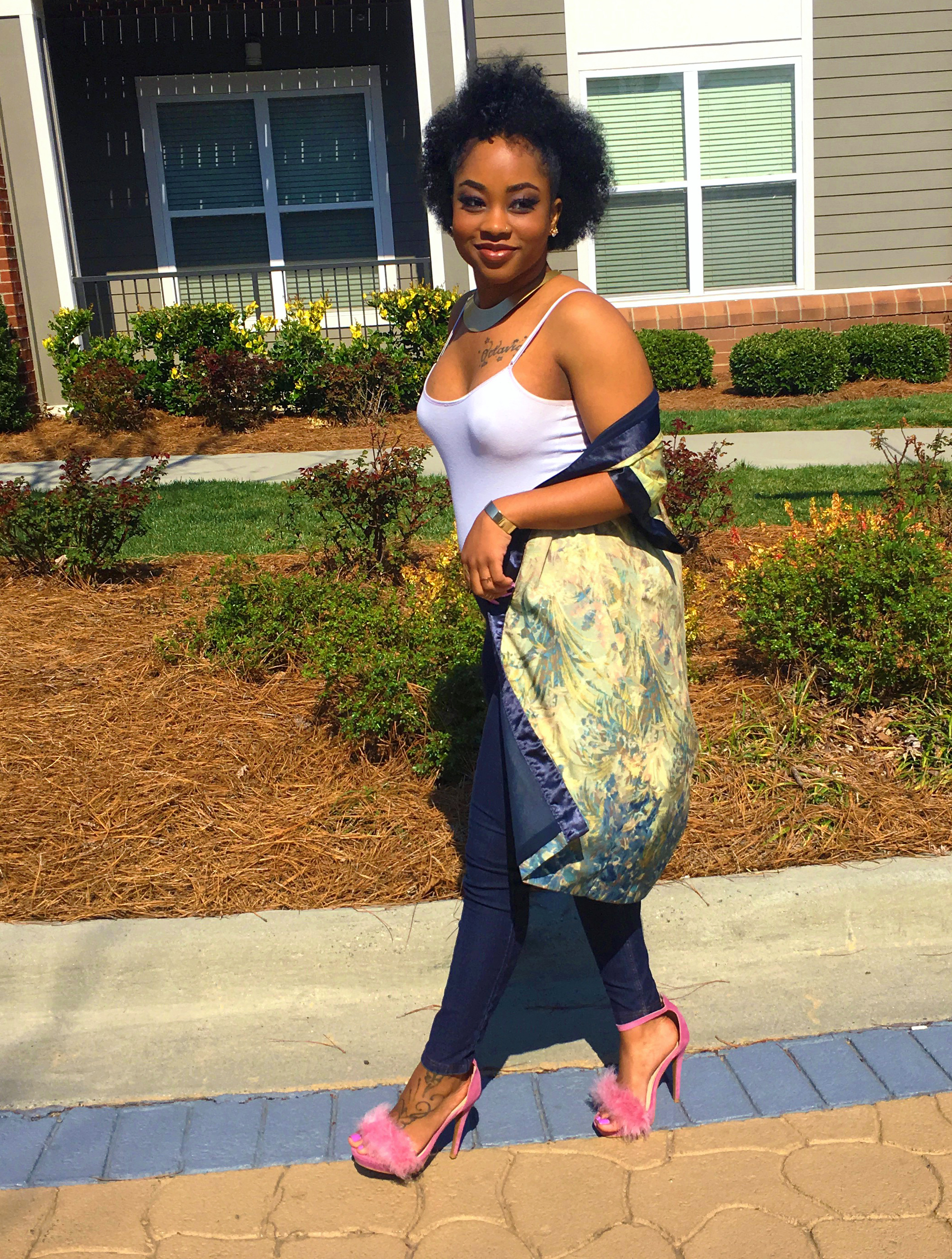 The key piece that stood out to me was her kimono robe. Kimonos are becoming a thing to have lately and if you didn’t know, it’s apart of Japanese fashion history. What I love about kimonos are the details of the floral designs or mixed patterns that I been seeing in stores. Oh…once again, I have scored a great deal at Goodwill when I found the one I have on here! I don’t remember what I paid for it (probably was $5) but since it’s from the thrift store then you know it was super inexpensive. #ALLofThisWINNING ?? I wanted to add a twist to the heels though. In my floral kimono, (maybe hard to see) there is pink detail in the flowers which made me think of my pink furry heels.