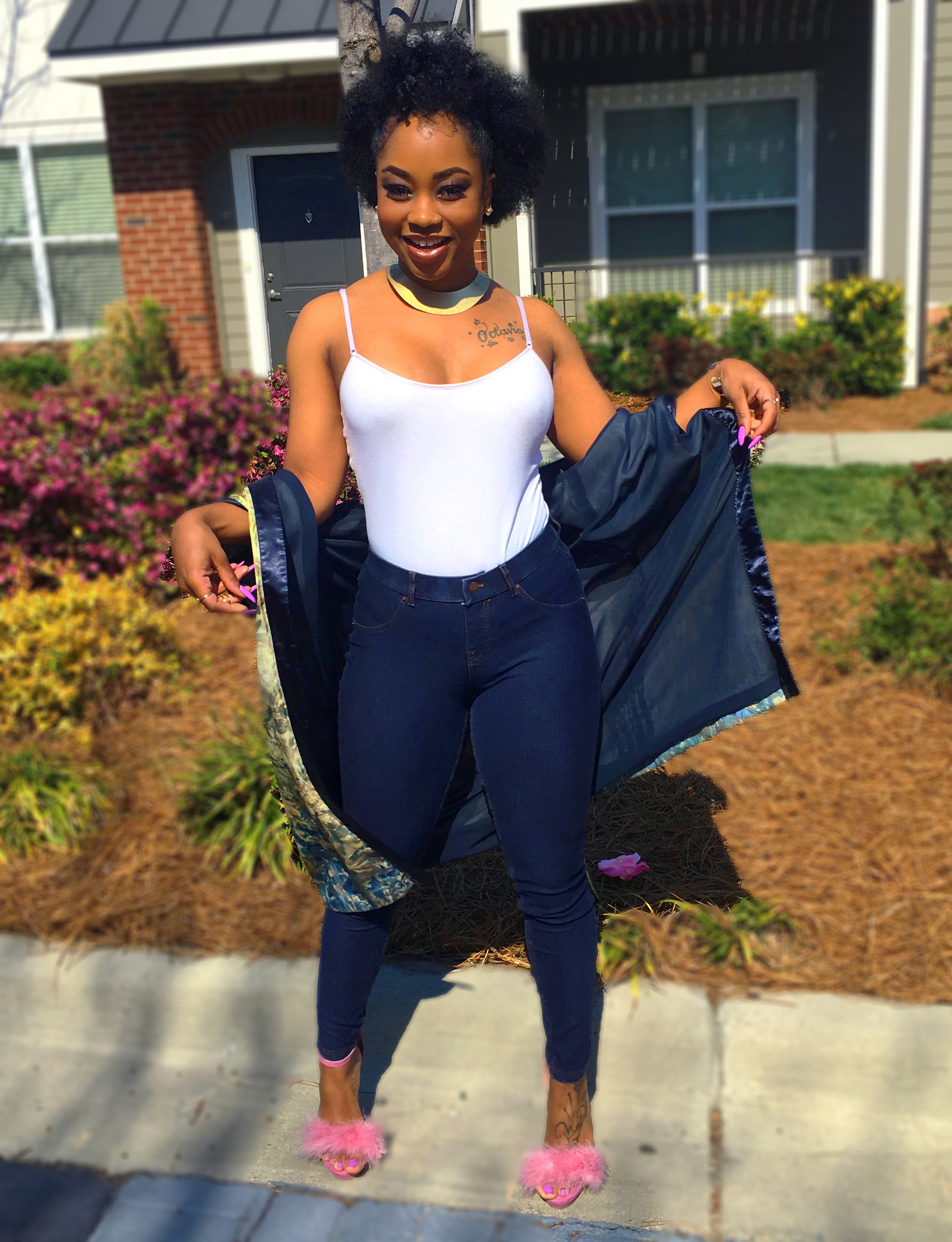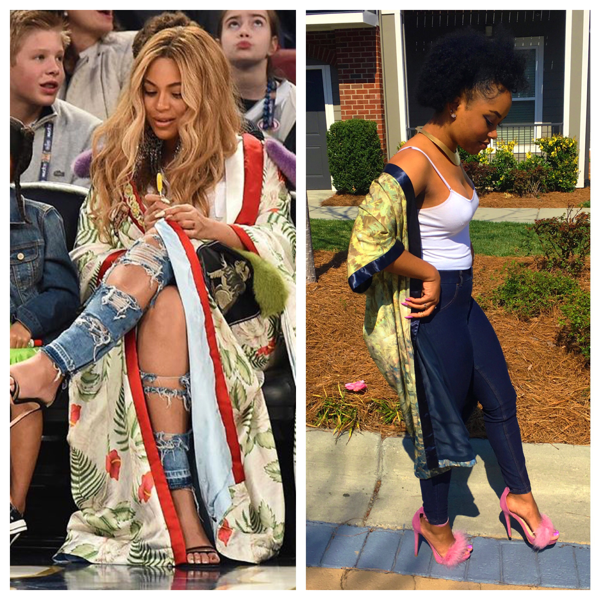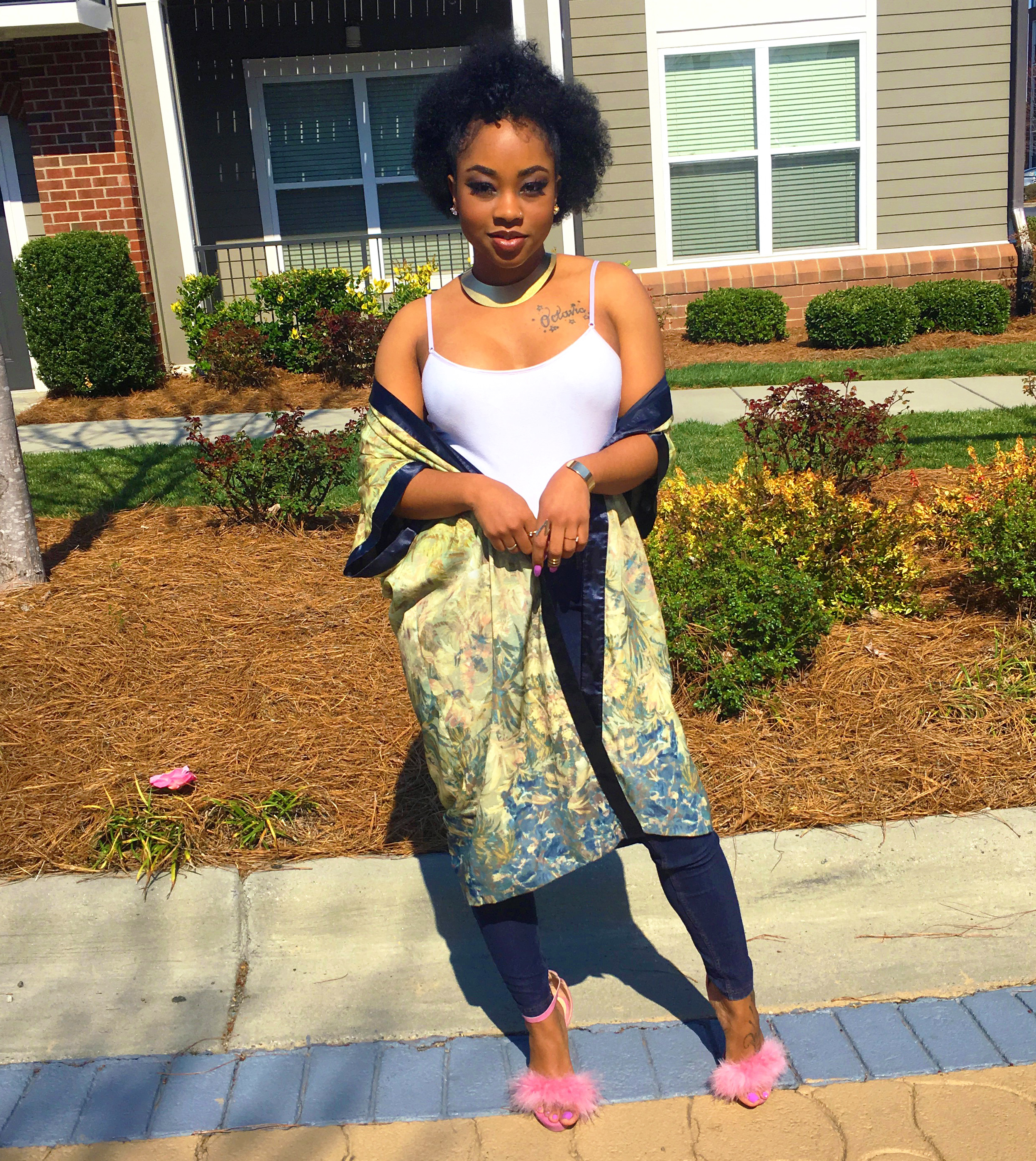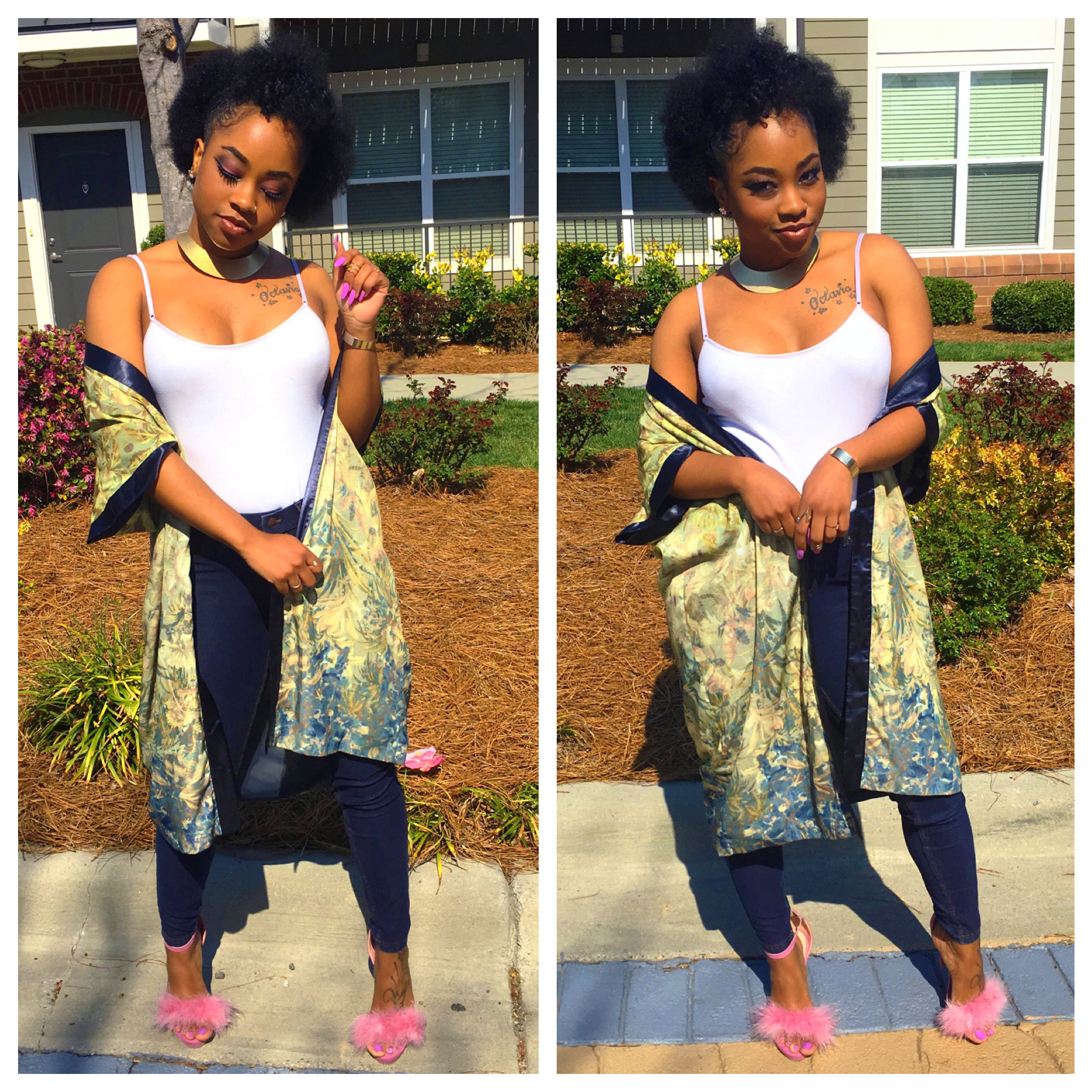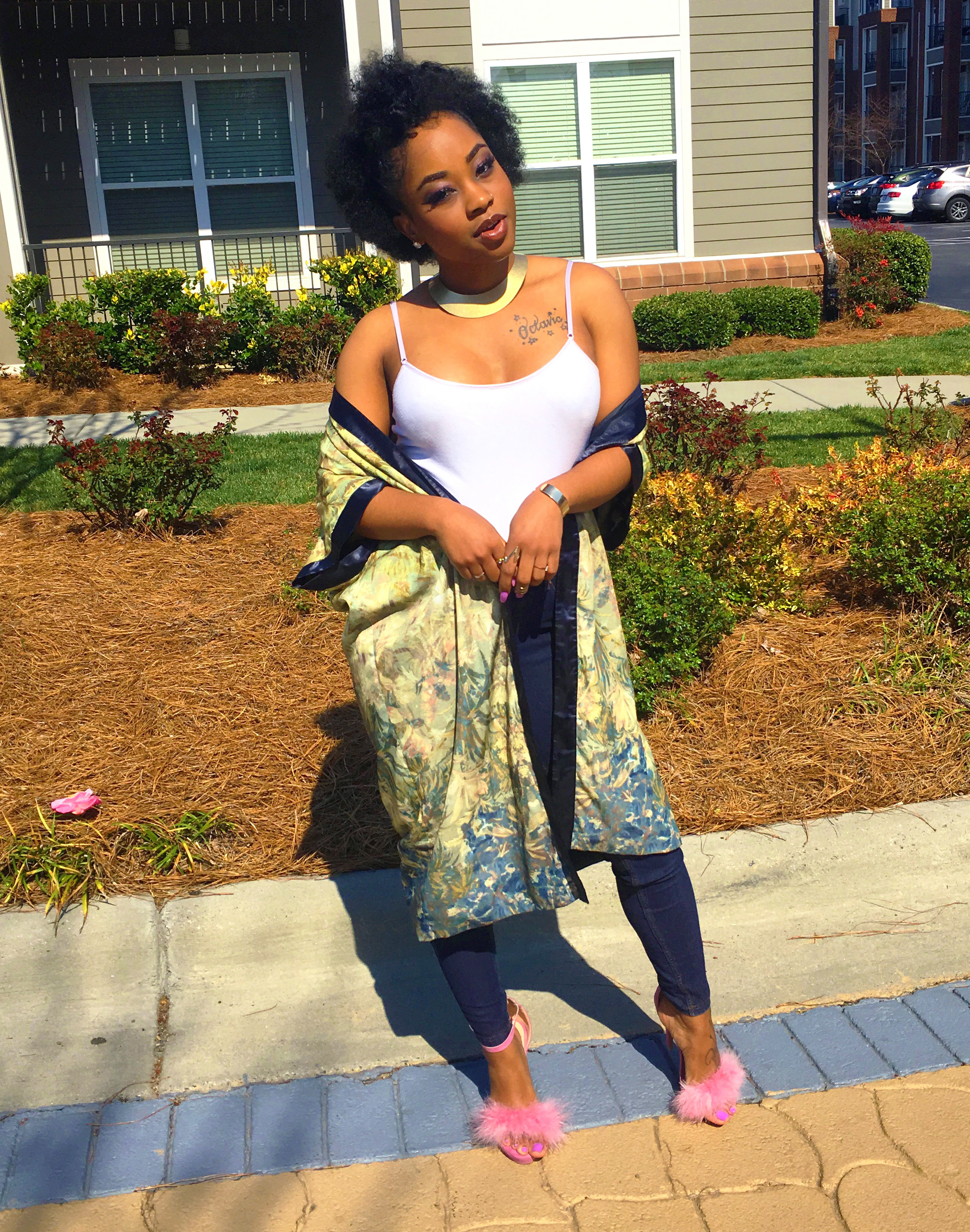 The key piece that stood out to me was her kimono robe. Kimonos are becoming a thing to have lately and if you didn’t know, it’s apart of Japanese fashion history. What I love about kimonos are the details of the floral designs or mixed patterns that I been seeing in stores. Oh…once again, I have scored a great deal at Goodwill when I found the one I have on here! I don’t remember what I paid for it (probably was $5) but since it’s from the thrift store then you know it was super inexpensive. #ALLofThisWINNING ?? I wanted to add a twist to the heels though. In my floral kimono, (maybe hard to see) there is pink detail in the flowers which made me think of my pink furry heels.