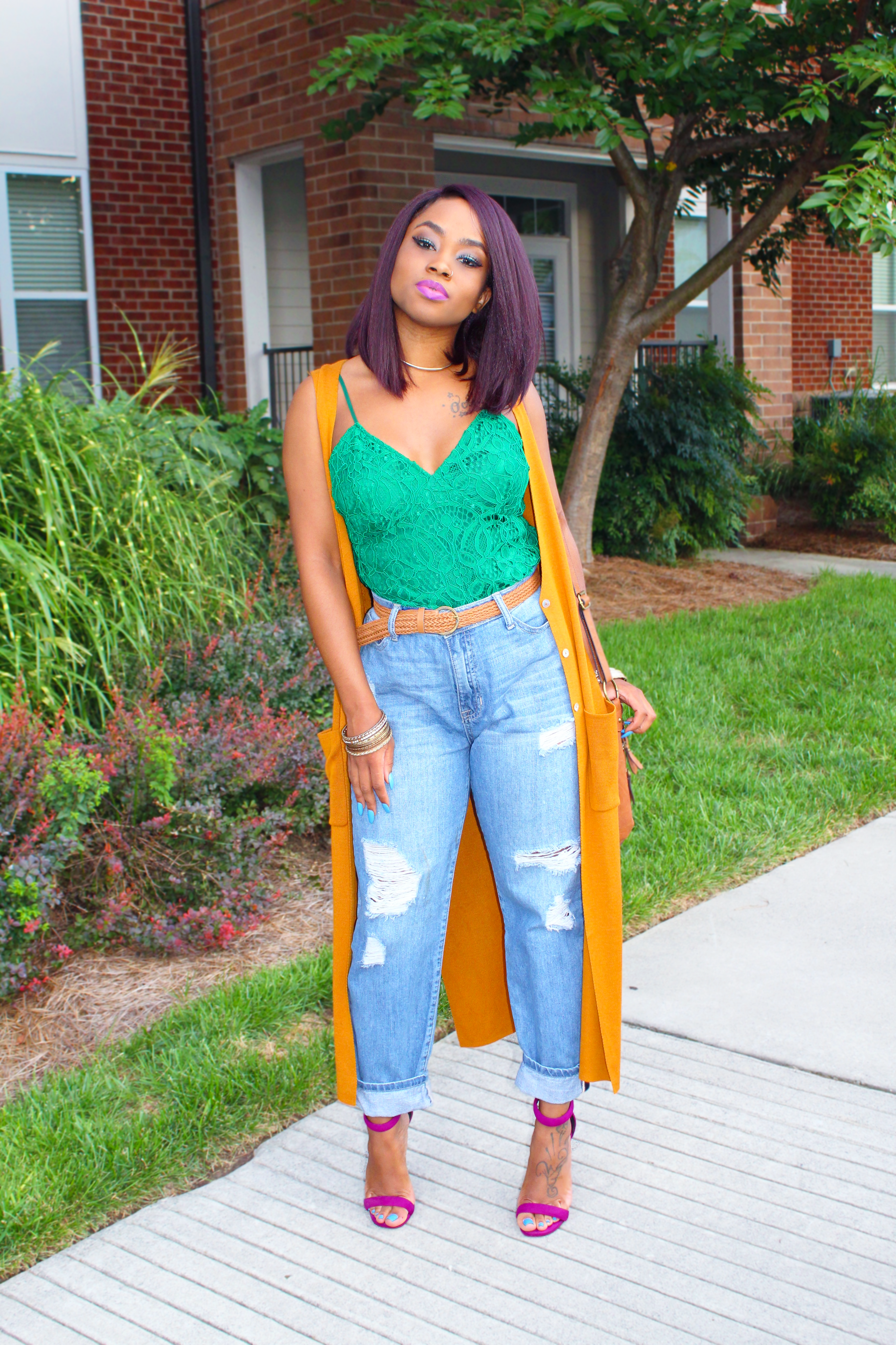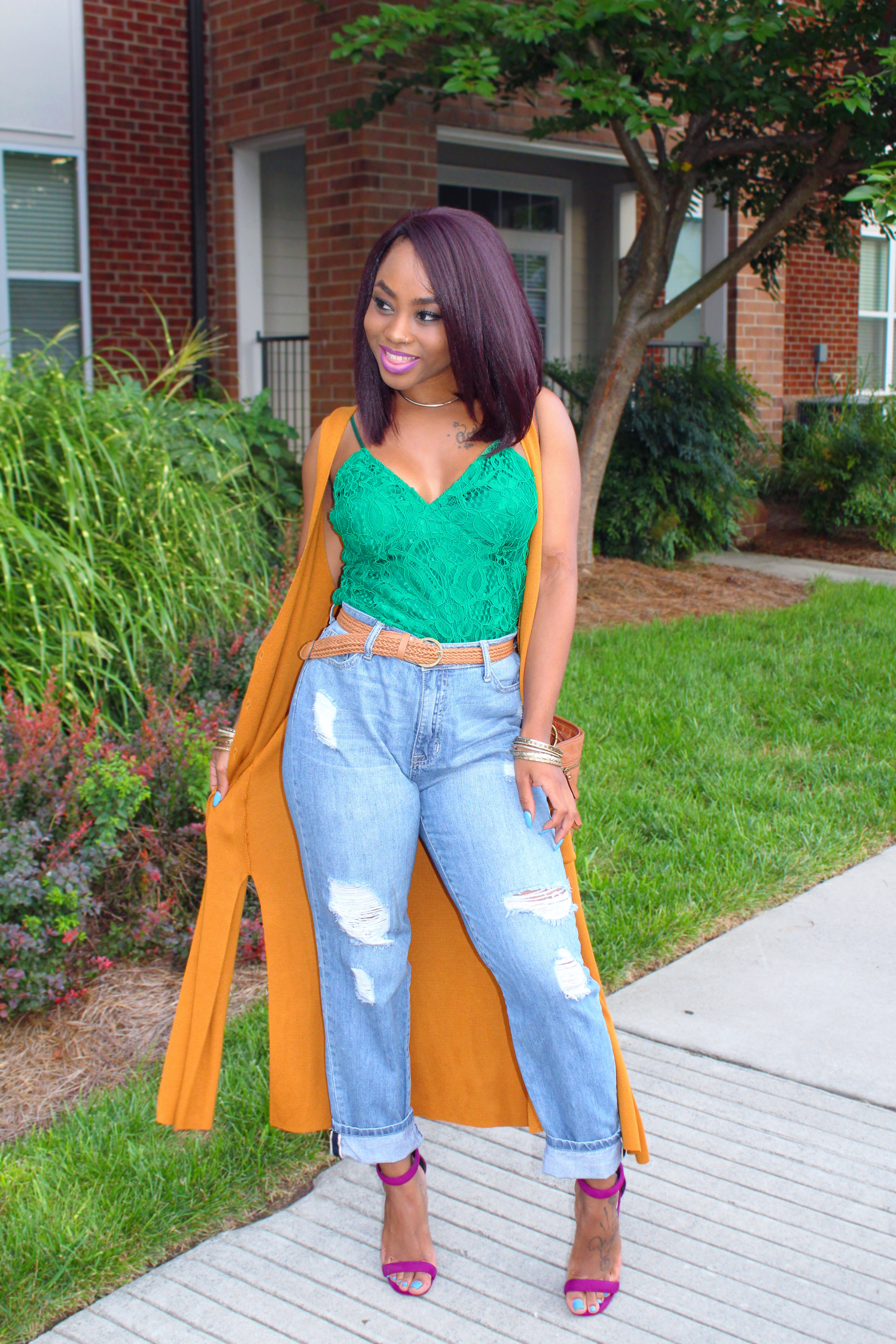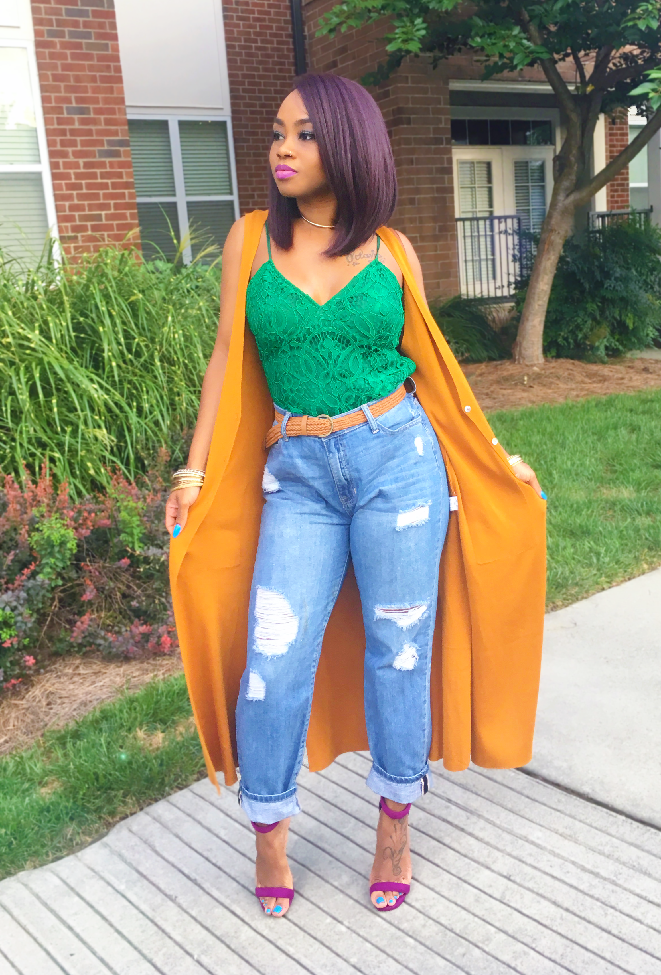 In order for my pants to not look so big around the waist, I made my belt as tight as I wanted it and pulled the extra space towards the back. Me doing that made it look bunky in the back but I had a solution! A long jacket, cardigan, or vest was the ANSWER! I just grabbed this long mustard vest (Forever 21 – $16) and that was my way of hiding it! PROBLEM SOLVED!!✅