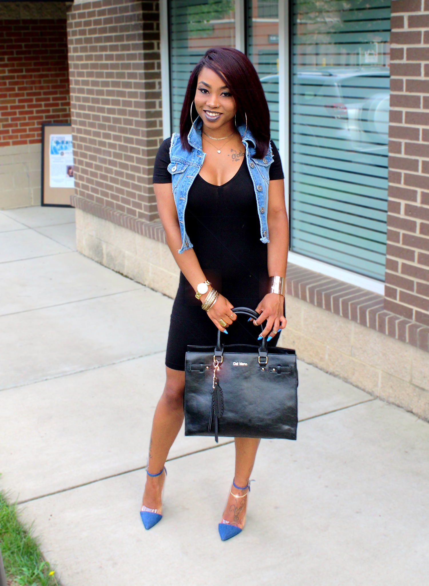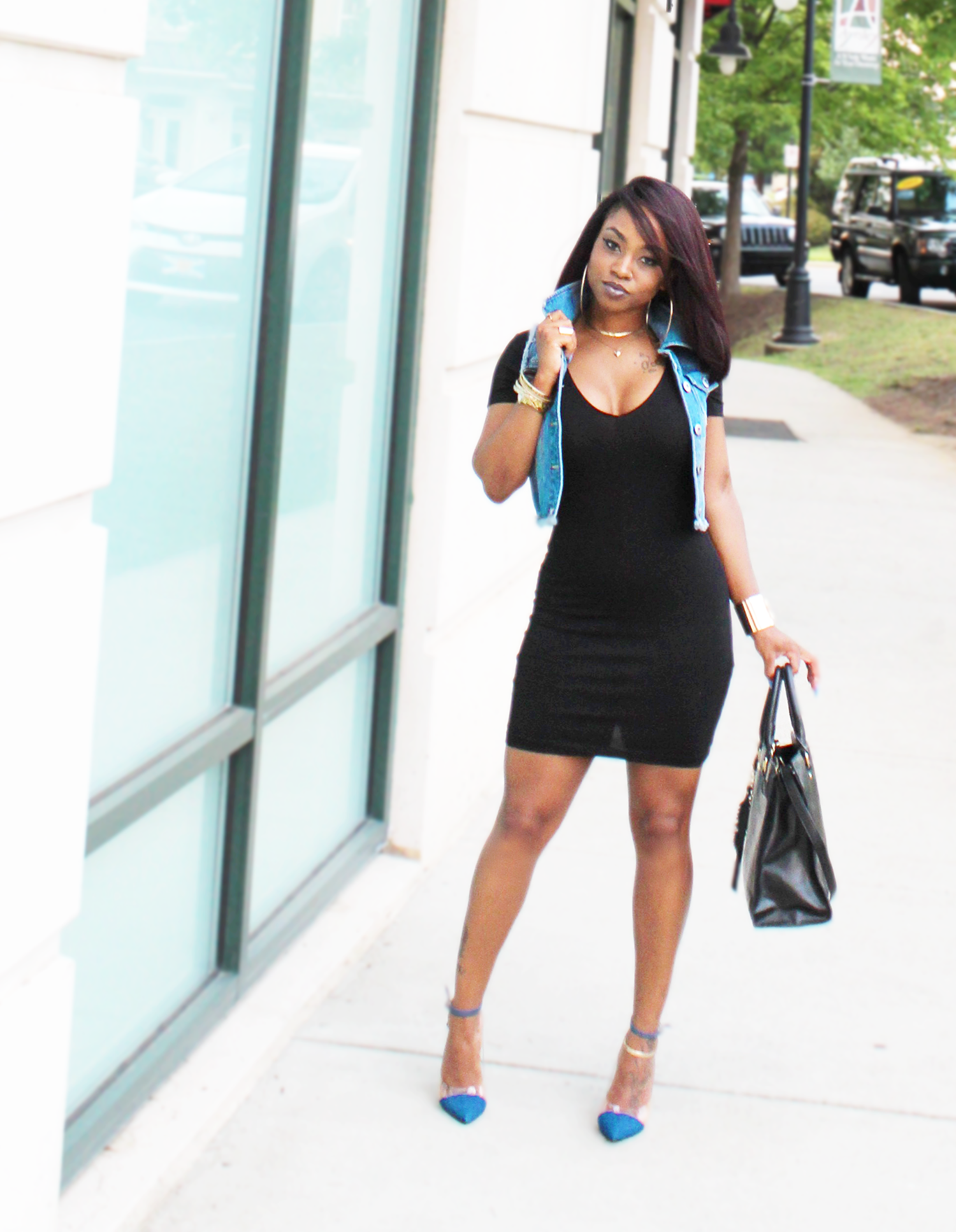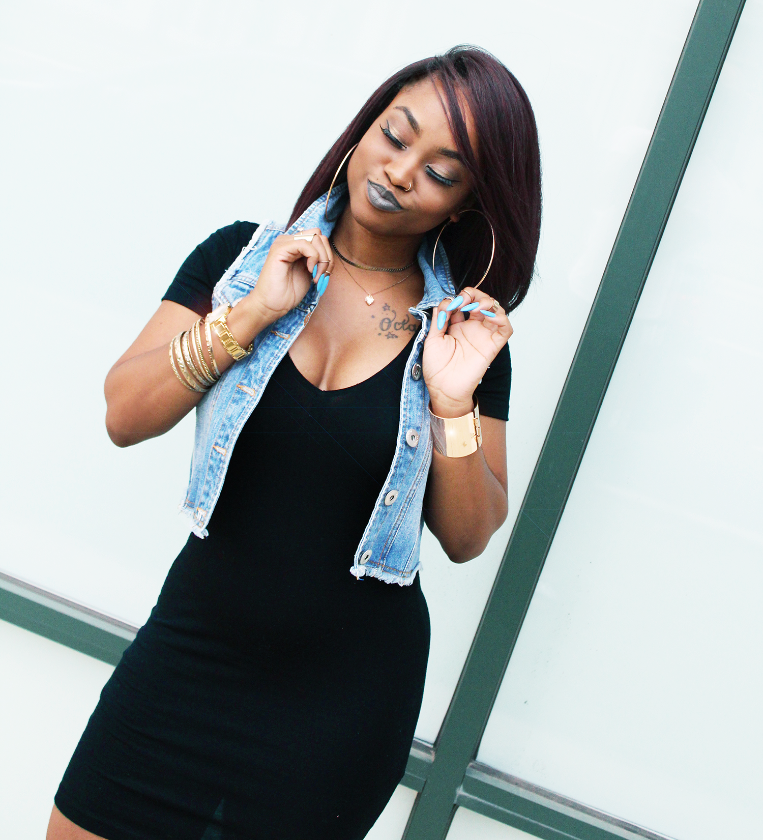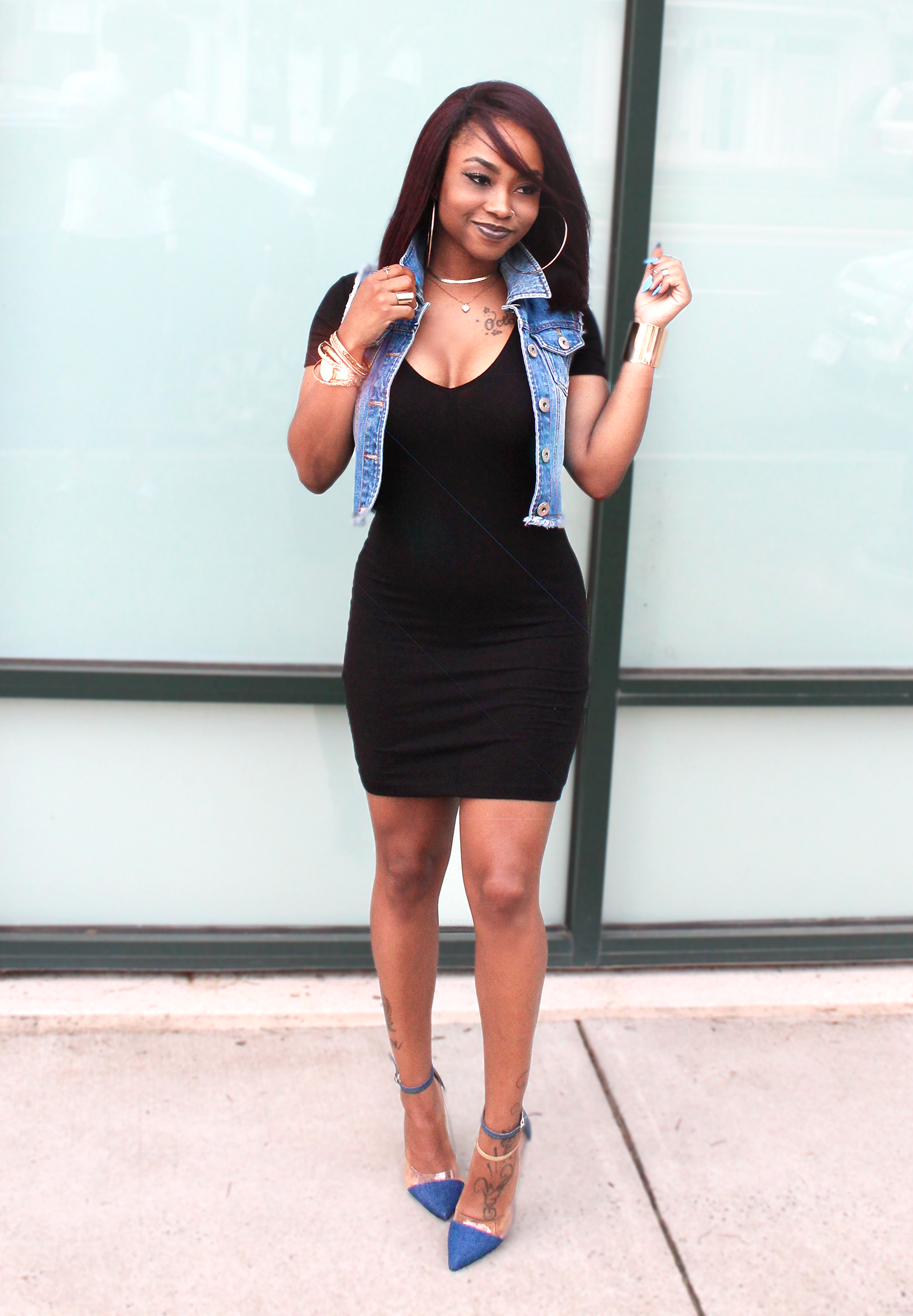 When deciding what to wear for this post, I wanted to do a dark look featuring black with a lot of gold. It was cute with the nice-fitting black dress and some of my favorite Forever 21 gold accessories, but once again I got that tangling, uncompleted feeling in my soul. My soul was saying ‘Octavia go in that room of yours and toss on some jean!’. I decided to listen and I loved it!!