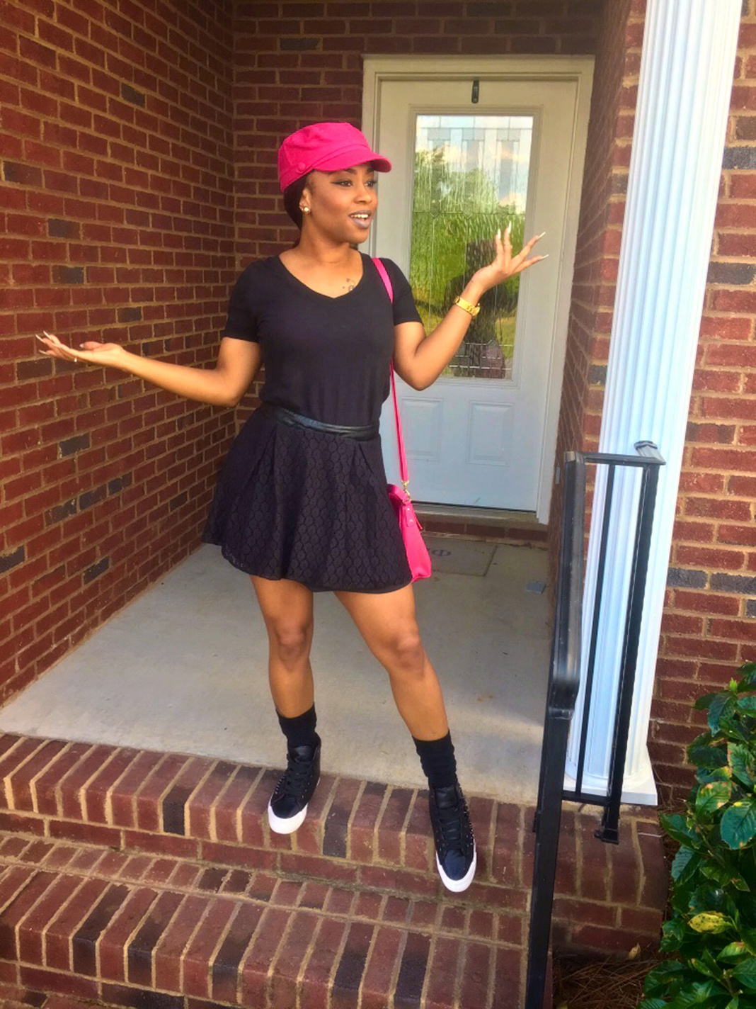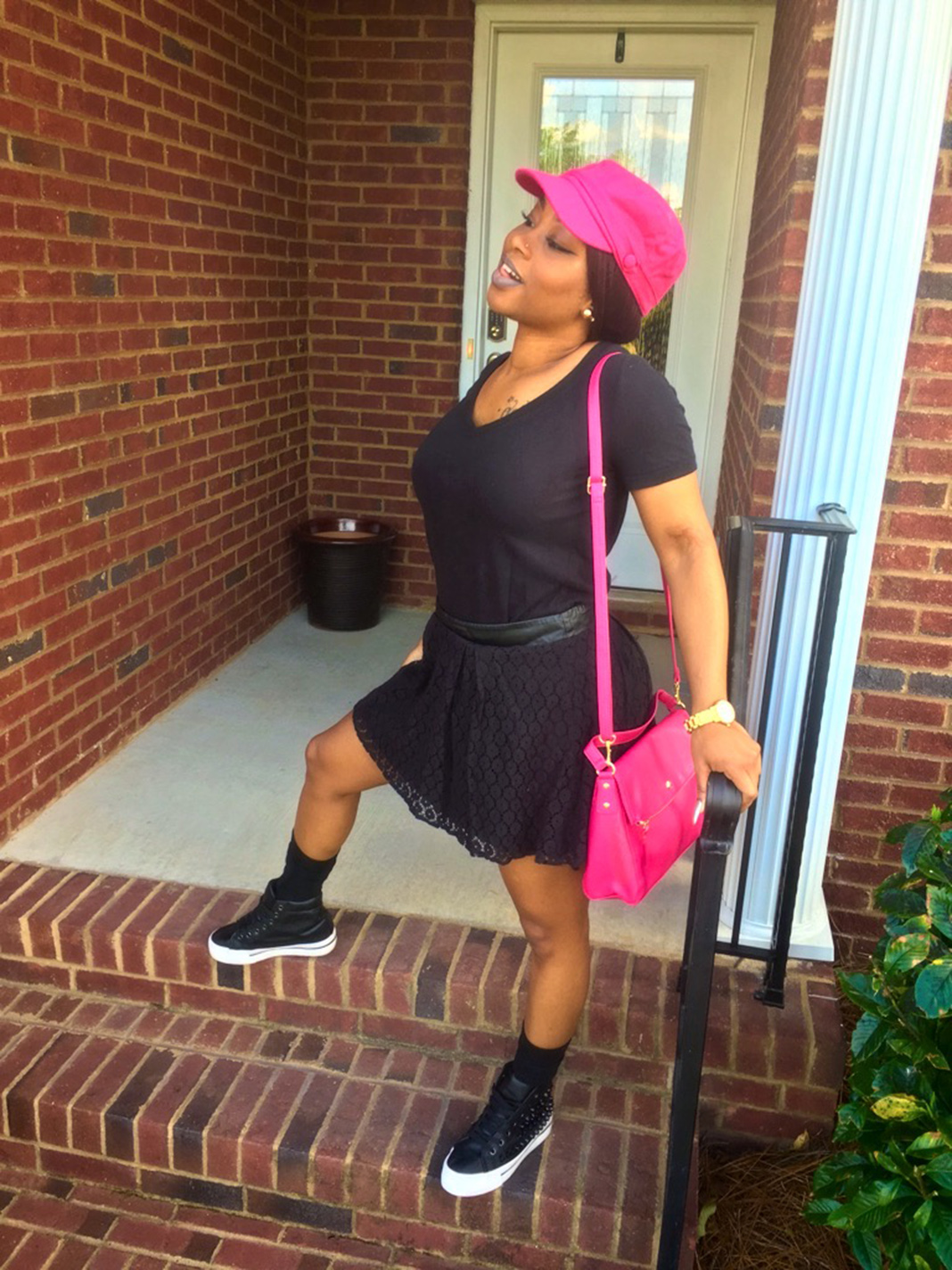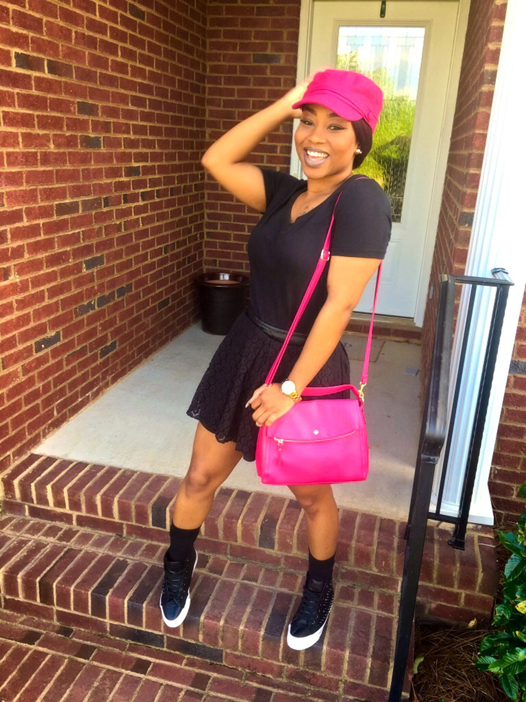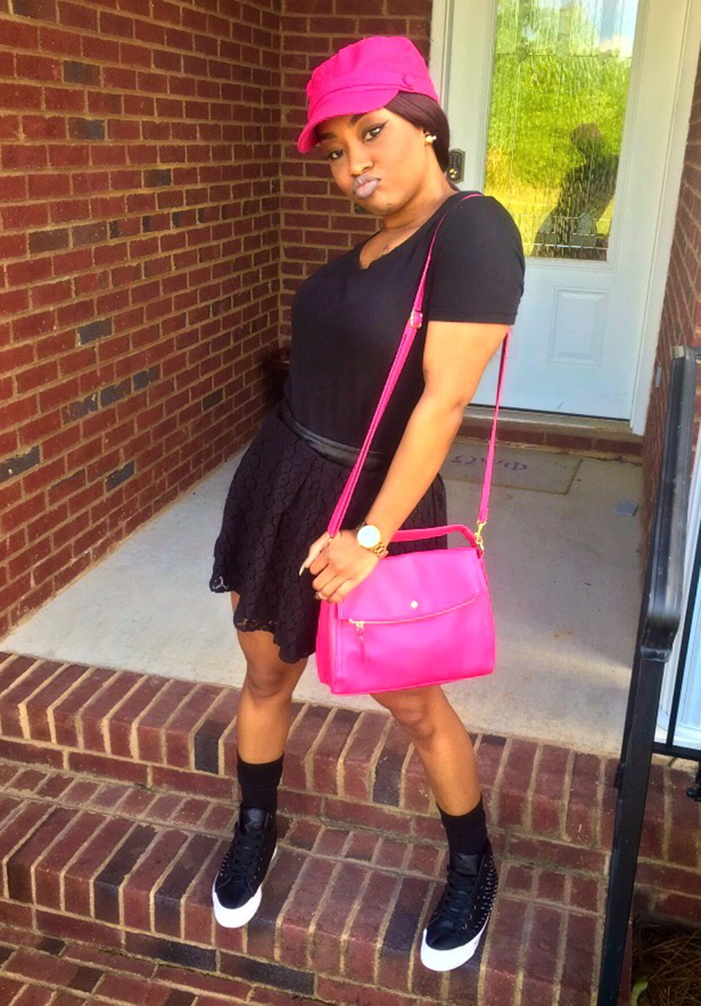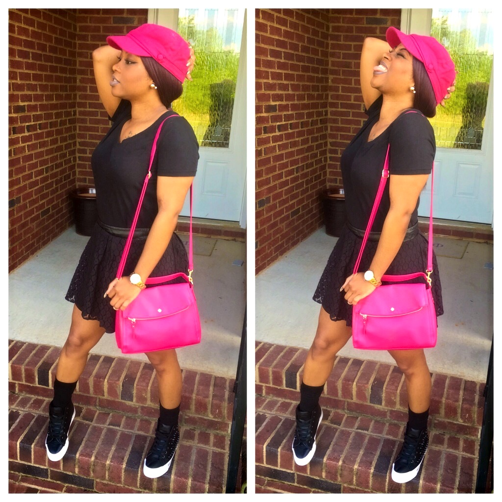 Newsgirl Hat, Black Top, Black Mini Skirt: Papaya | Shoes: AmiClubWear | Hot Pink Purse: TJ Maxx | Watch: Kate Spade from Belk