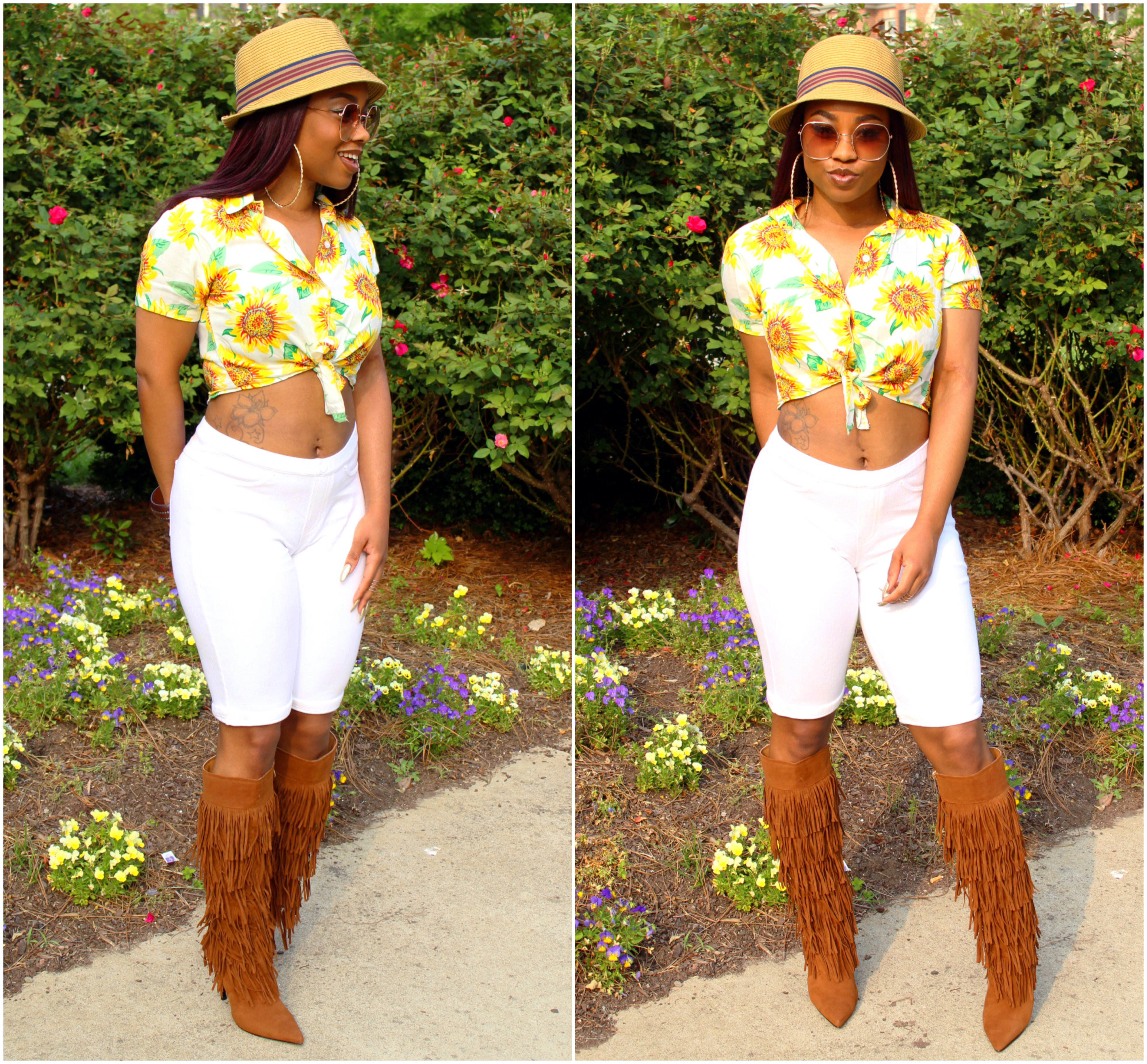 There are days when I get in this creative mood, where I start to put my outfits together. So, I had this sunflower crop top from Wetseal for years now that I wanted to finally wear and got these white HUE denim bermuda shorts from Belk that I already had on. Just trying on things at this point. Once it got down to the shoes, my brain froze.