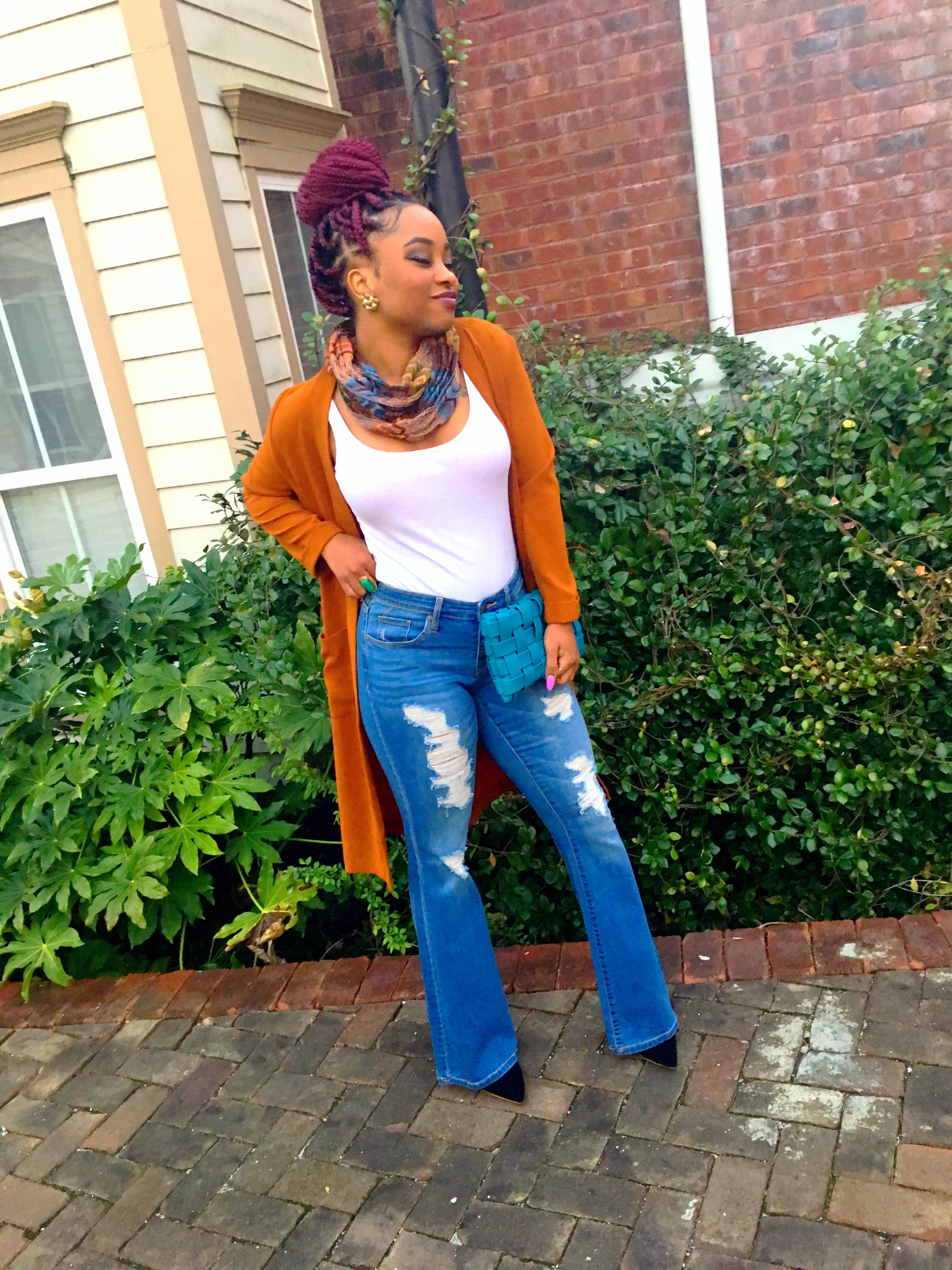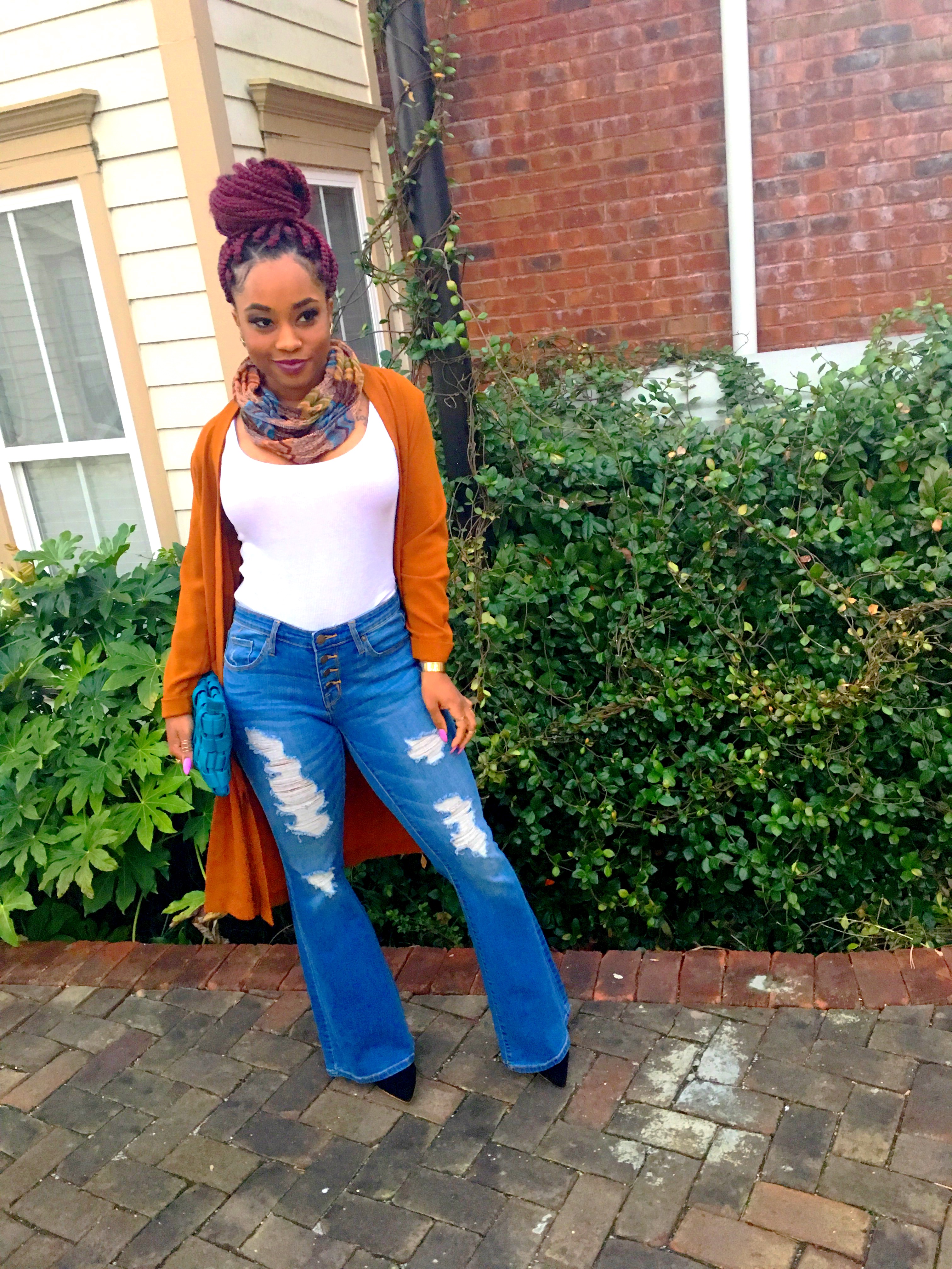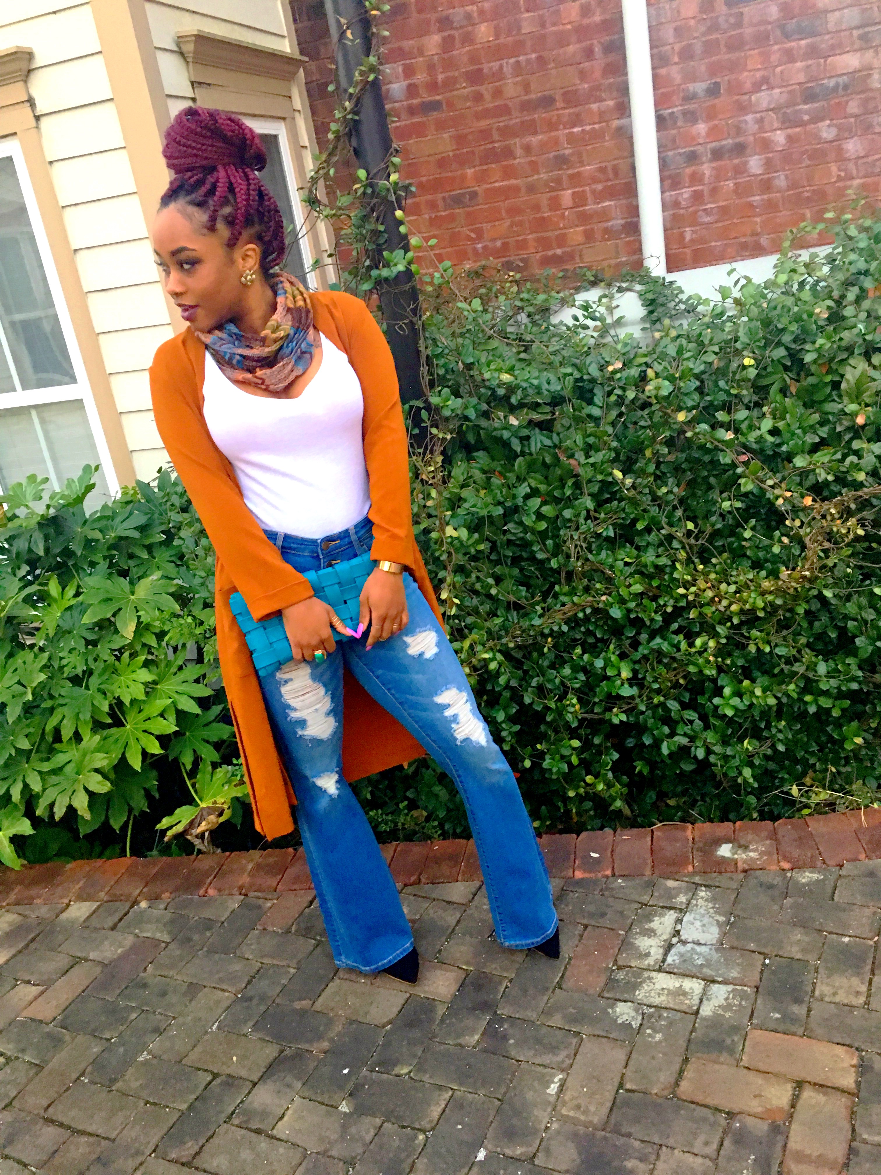 Hey, I know you probably thinking this outfit is kinda fall-ish. But hey let’s all remember, the weather is jacked up!! Not me! lol One day it’s beautiful, nice weather…next day it’s all cloudy and the wind is going ham!! I took advantage of one of the days it was super windy and the sky had no life. I bought this flare out, ripped jeans from Target (on sale $10?) and got this dark spice colored, long cardigan from H&M (another item on sale $5?) several months ago. Allllll about sale items!! Never got to wear it because I completely forgot I had it.