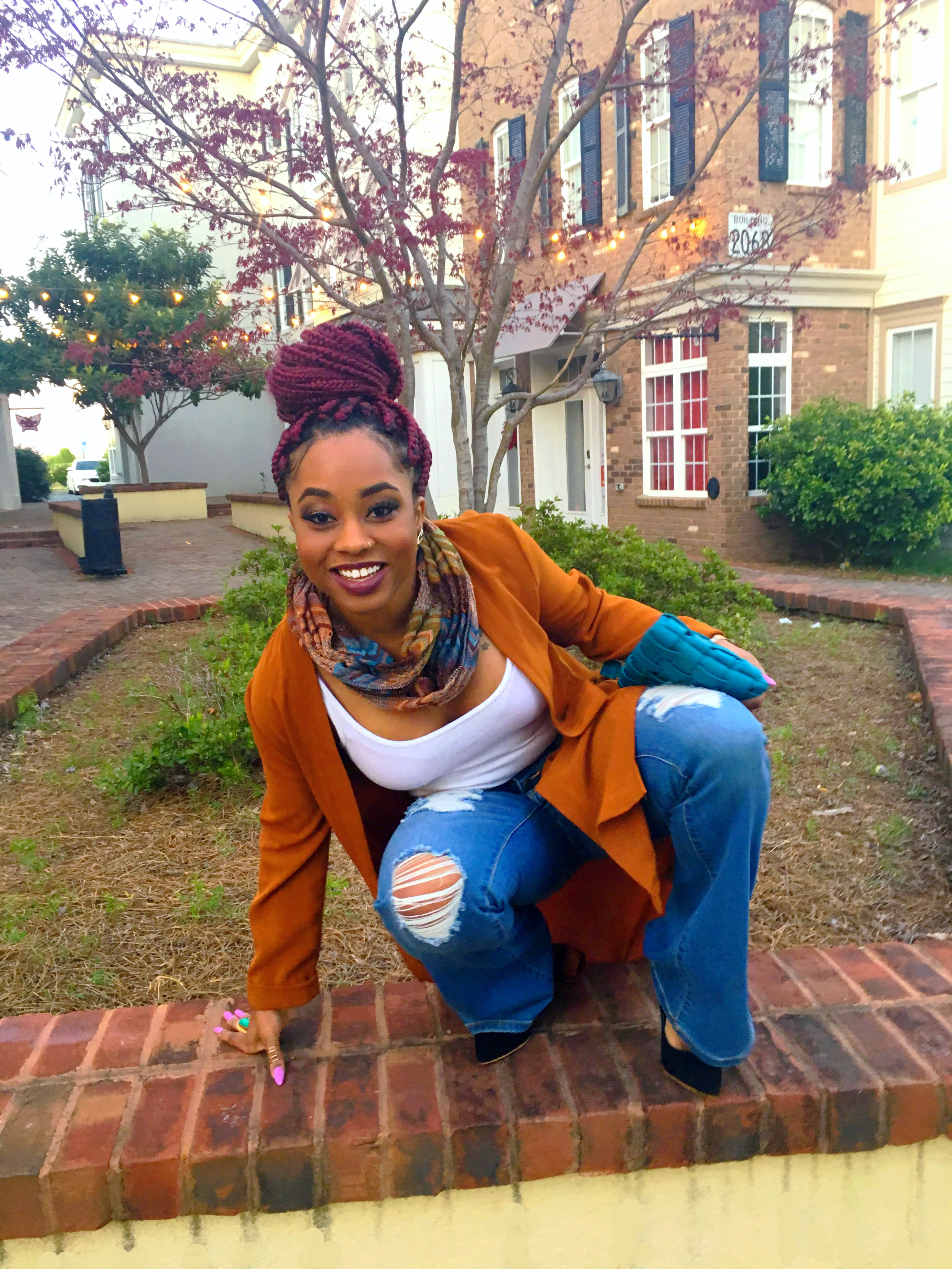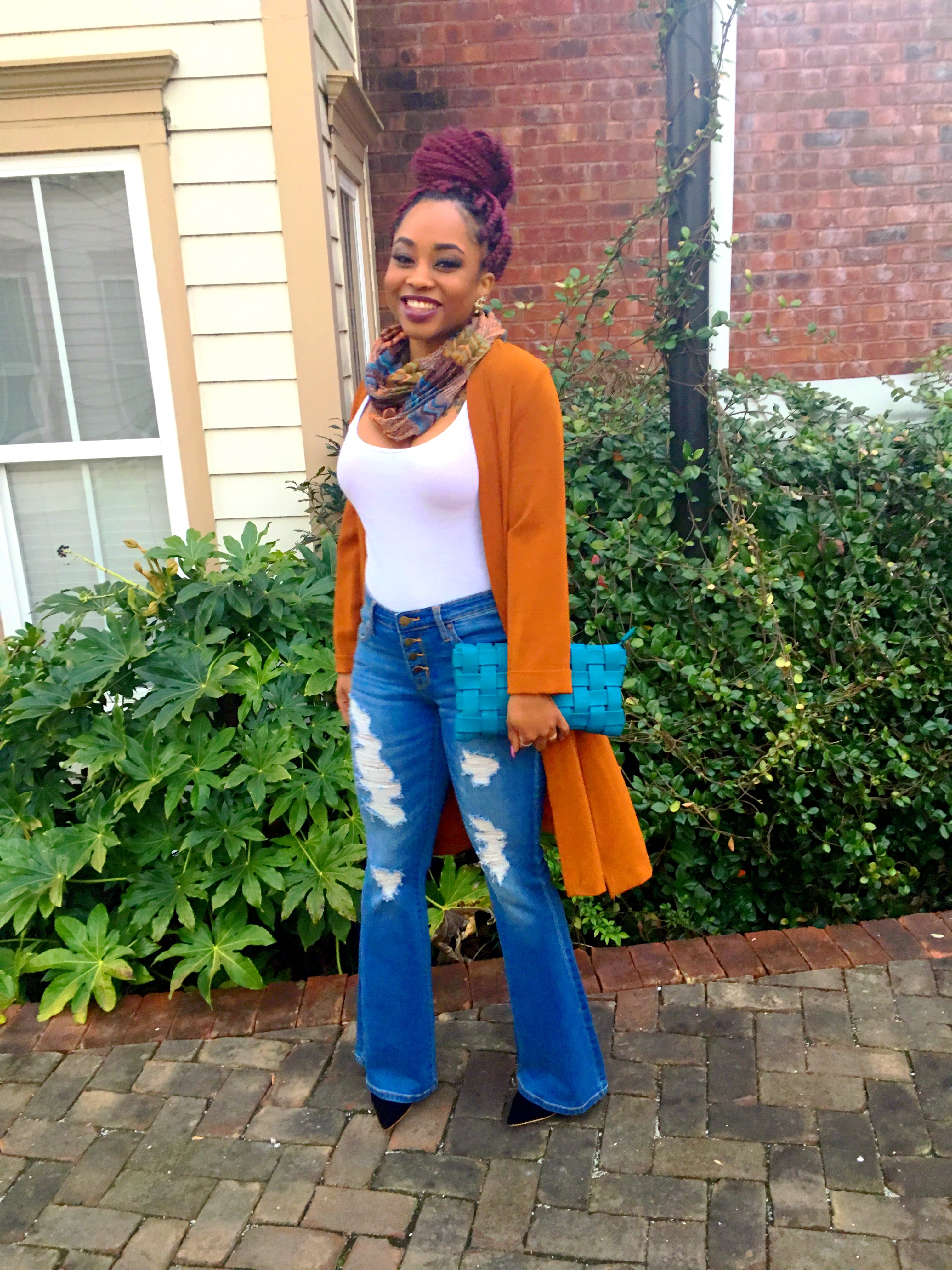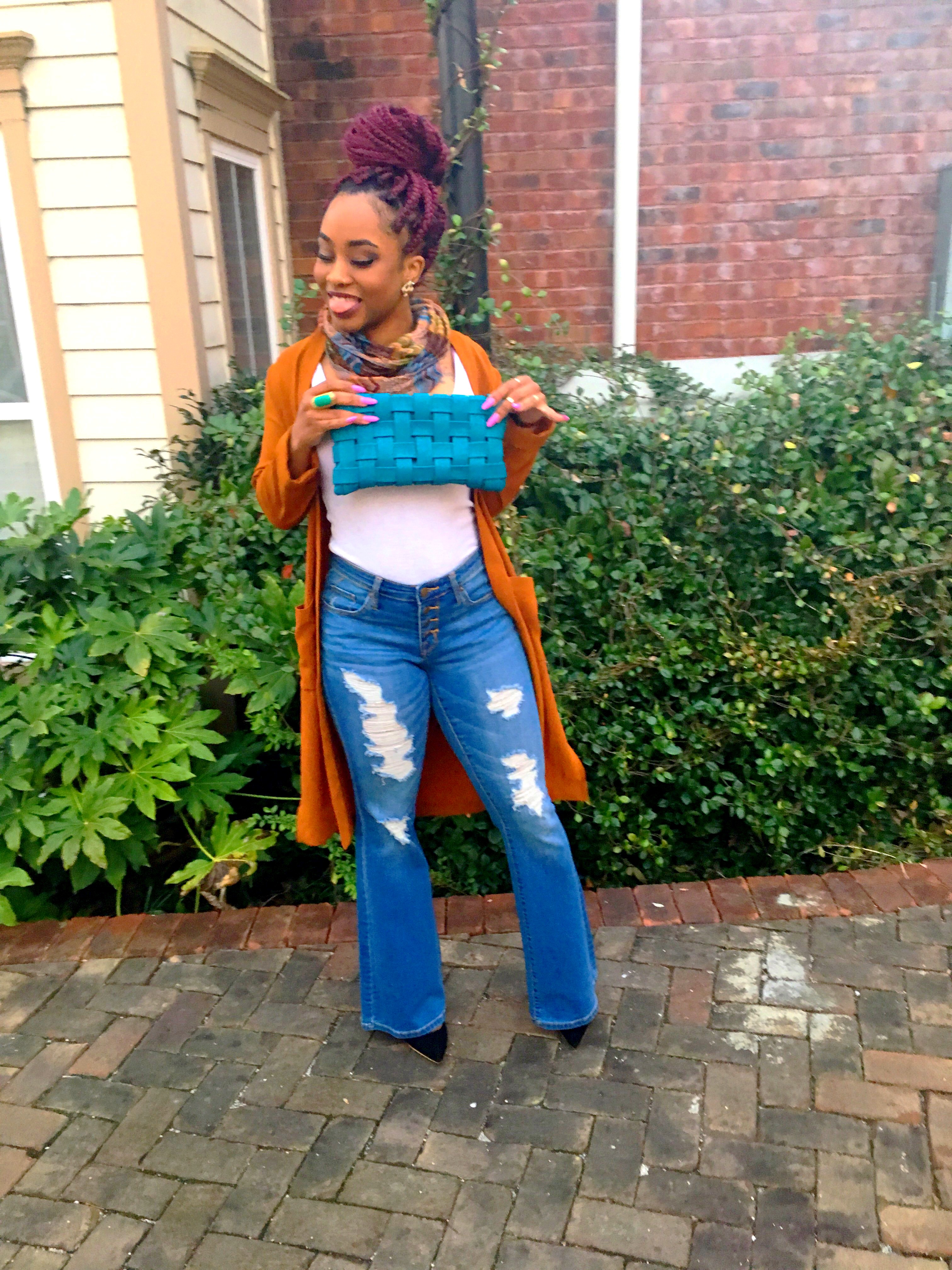 Hey, I know you probably thinking this outfit is kinda fall-ish. But hey let’s all remember, the weather is jacked up!! Not me! lol One day it’s beautiful, nice weather…next day it’s all cloudy and the wind is going ham!! I took advantage of one of the days it was super windy and the sky had no life. I bought this flare out, ripped jeans from Target (on sale $10?) and got this dark spice colored, long cardigan from H&M (another item on sale $5?) several months ago. Allllll about sale items!! Never got to wear it because I completely forgot I had it.