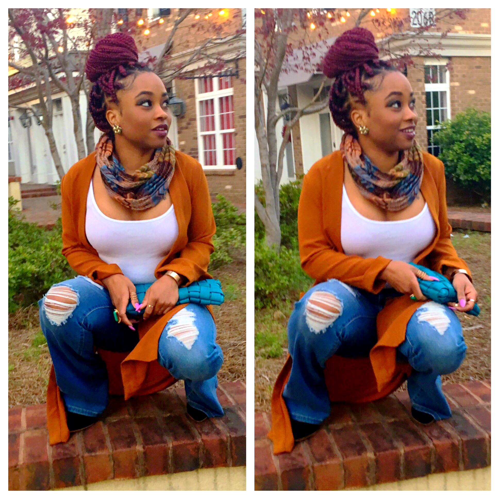 Before it gets consistently warm outside, I wanted to wear both along with one of my scarves I barely get to wear. The colors on the scarf was a great addition to bring more colors out. Quickly grabbed my stitch teal clutch (another item I barely use?) It was awesome to see that my teal color was one of the colors that is in my scarf!! YAY SCARF!